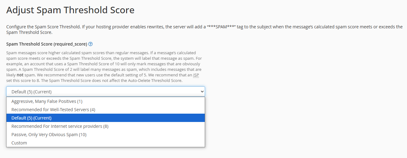 Recommendations: Start with a threshold of “5” .  This setting is a good balance to correctly identify spam while avoiding false positives.