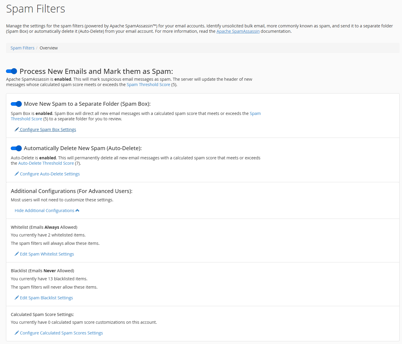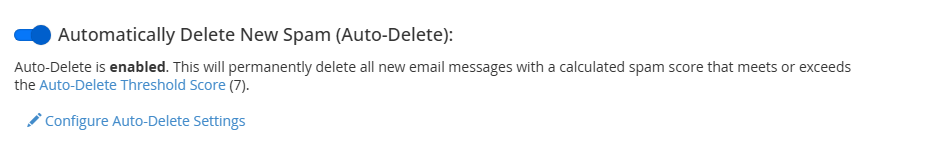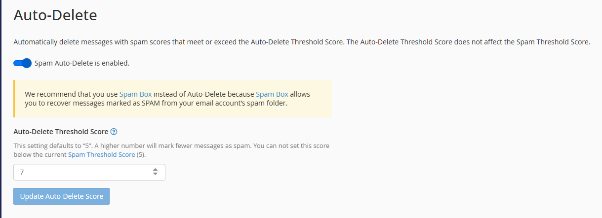 Recommendations: Enable “Automatically Delete New Spam” and set the “Auto-Delete Threshold Score” to 7 or more.