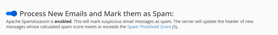 This section enables or disables SpamAssassin. When enabled, the server will begin filtering emails using a scoring method. Emails above the “Spam Threshold Score” will be identified as spam.